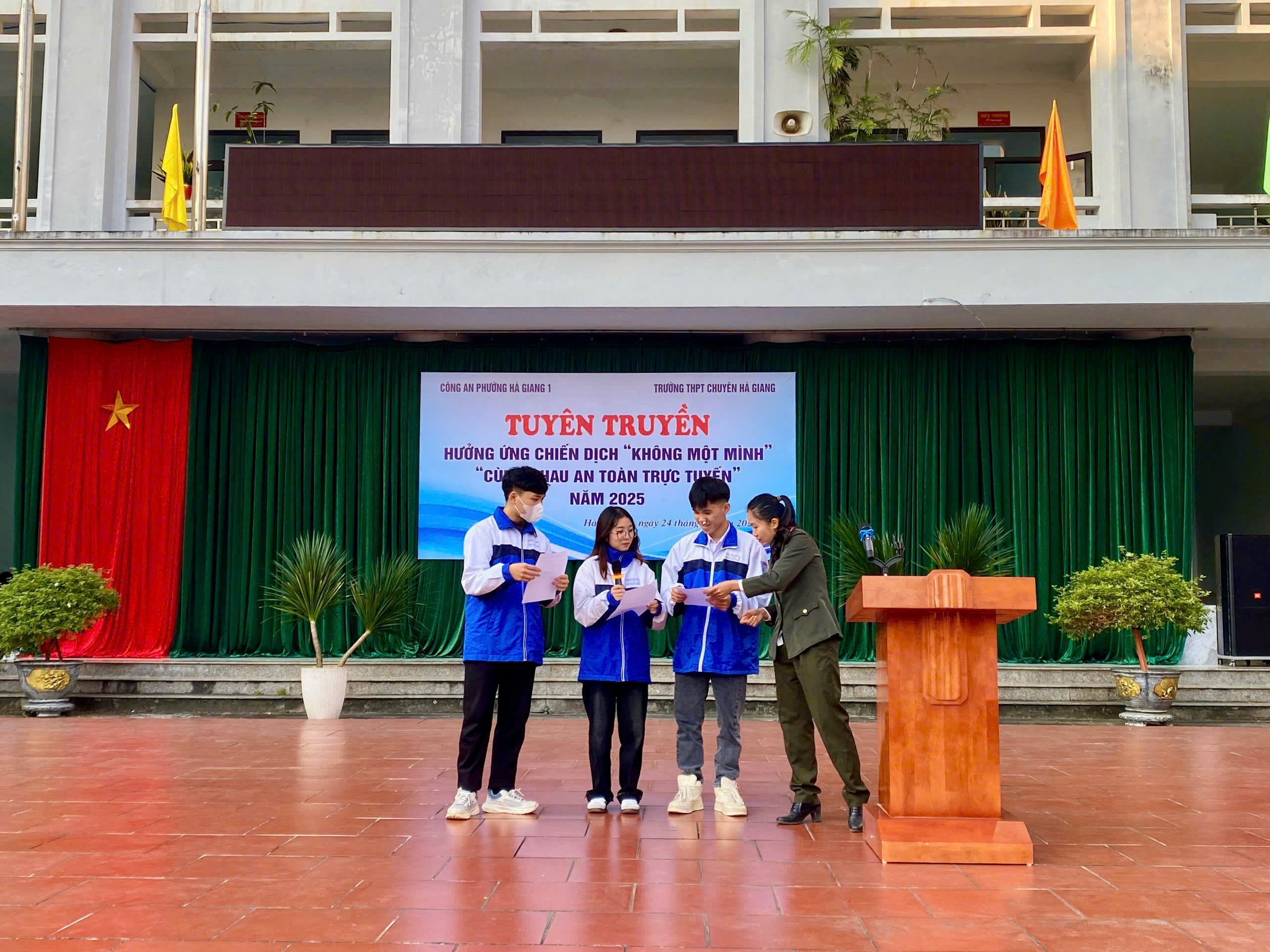 Trong tháng 11 năm 2025, Công an phường Hà Giang 1 đã phối hợp với các trường học trên địa bàn: Trường THCS Lê Lợi, Trường THPT Chuyên Hà Giang và Phân hiệu Đại học Thái Nguyên tại Hà Giang tổ chức chuỗi hoạt động tuyên truyền về an ninh, an toàn trên không gian mạng, phòng ngừa bắt cóc online, lừa đảo công nghệ cao và hướng dẫn kỹ năng tự bảo vệ khi tham gia môi trường mạng. Chương trình được triển khai trong khuôn khổ chiến dịch “Không một mình – Cùng nhau an toàn trực tuyến”