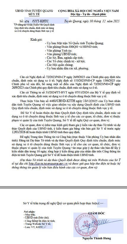 Đăngtải vàxin ýkiếnvào Quyết định Quy định tiêu chuẩn, định mức sử dụng xe ô tô chuyên dùng thuộc lĩnh vực y tế