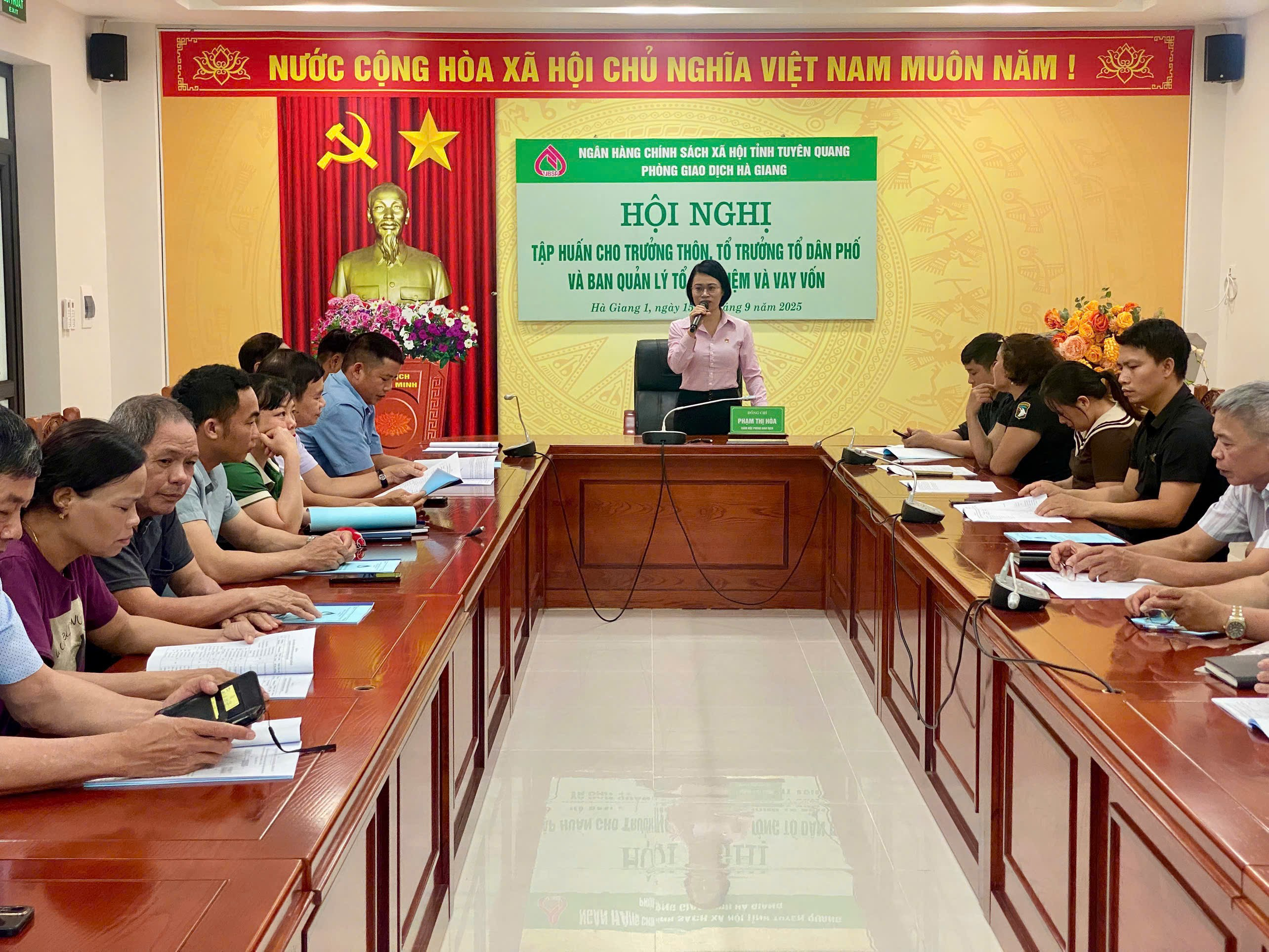 Thực hiện Kế hoạch số 29/KH-NHCS ngày 08/8/2025 của Phòng giao dịch NHCSXH Hà Giang về việc tập huấn đối với cán bộ phối hợp thực hiện tín dụng chính sách xã hội trên địa bàn phường Hà Giang 1, Hà Giang 2 và xã Ngọc Đường. Từ tháng 9/2025 đến tháng 11/2025 Phòng giao dịch NHCSXH Hà Giang tổ chức 11 lớp Hội nghị tập huấn cho Trưởng thôn, Tổ trưởng tổ dân phố và Ban quản lý Tổ TK&VV.