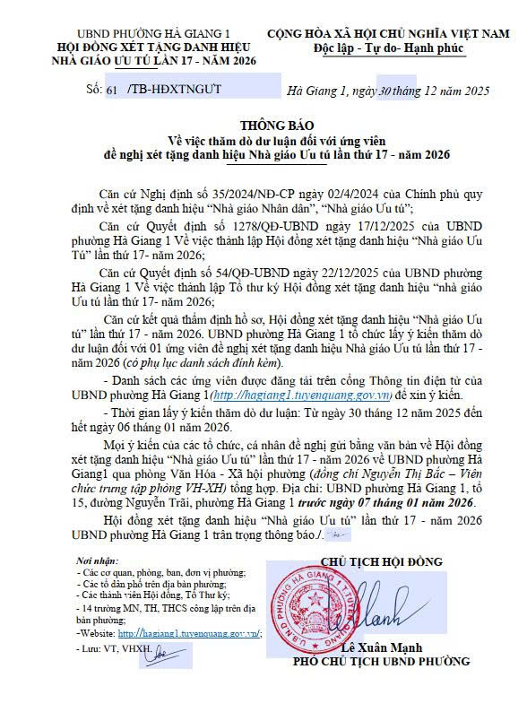 Về việc thăm dò dư luận đối với ứng viên đề nghị xét tặng danh hiệu Nhà giáo Ưu tú lần thứ 17 - năm 2026